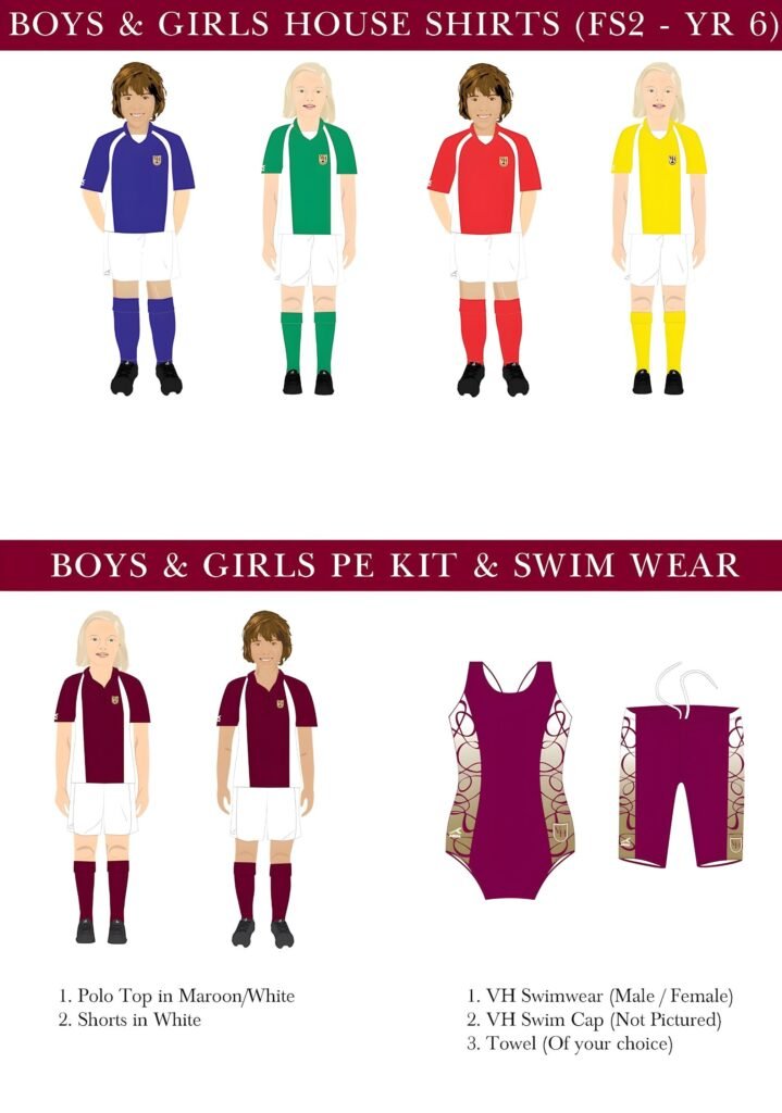 Specialised house kits are worn during house events, sports day, and inter-house competitions. Each child is assigned to one of the school's houses and will wear their house colours with pride during these occasions.